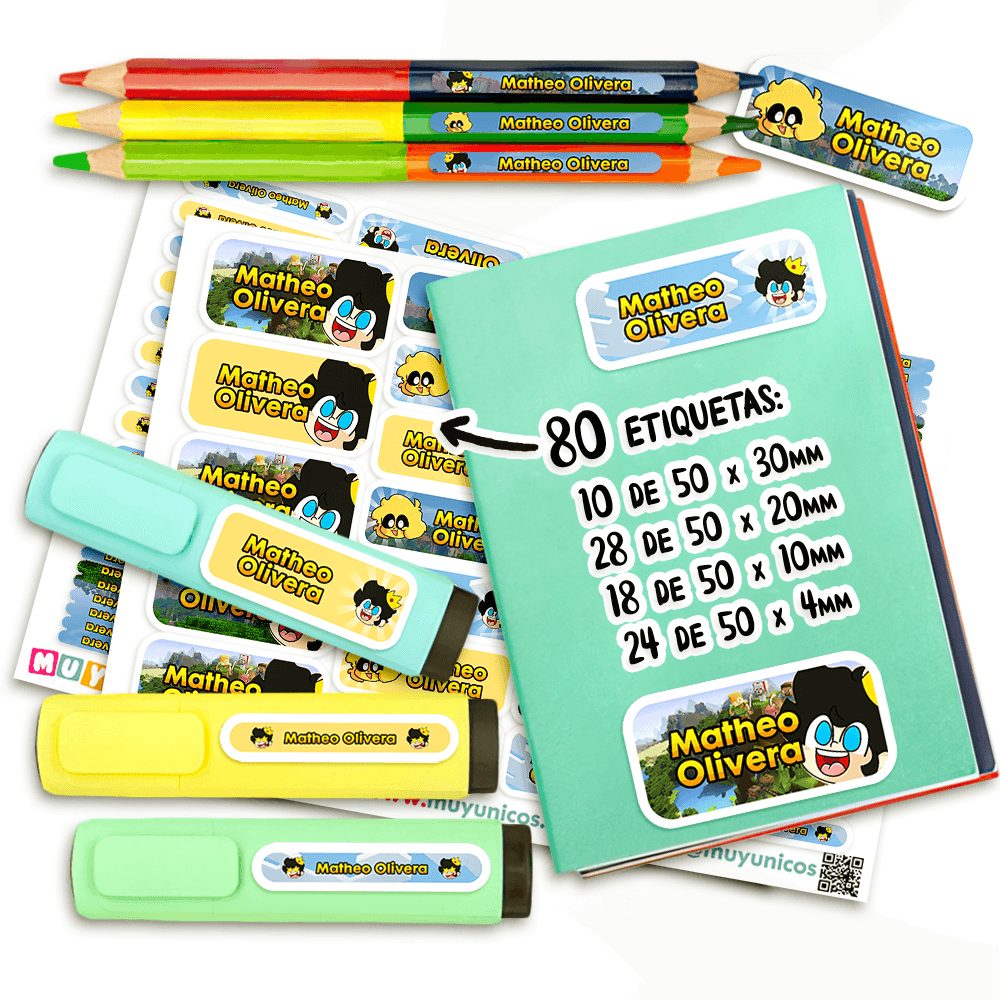 Recibe un kit de etiquetas escolares personalizadas con el nombre que elijas, listas para imprimir. Diseñamos este set a mano para ti y te lo enviamos en un archivo PDF. Este práctico archivo digital en formato PDF de 14 páginas te permite imprimir las etiquetas que necesites, en el tamaño que quieras y cuantas veces desees. Tu compra incluye: Más de mil etiquetas personalizadas de distintos tamaños, diseñadas para adaptarse a todos los útiles y objetos personales. Etiquetas (5×3 cm): Ideales para cuadernos, carpetas, estuches, mochilas y loncheras. Etiquetas (5×2 cm): Perfectas para reglas, marcadores gruesos, sacapuntas, agendas y pegamento…